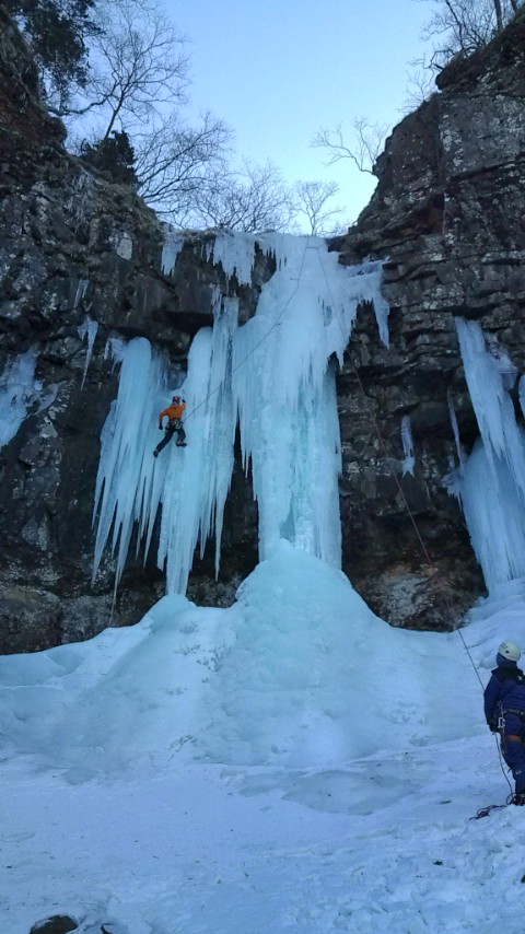 前日から行者に入っている友人と小滝前で朝集合。初アイスなので小滝でボルダーで練習。先行パーティが大滝で遊んでいたので、様子をみて大滝へ。私がリードすると時間がかかるので、トップロープでもいいから遊ばせてもらえないかな~と交渉する。もう京都へ帰るので、トップロープを張りましょうか?(京都弁)。とのありがたい申し出に甘えてしまいました。おかげで、いい練習ができました。ちなみに、1月の戸台で京都の方にまた会いました。みんな同じ所に行くんですね。