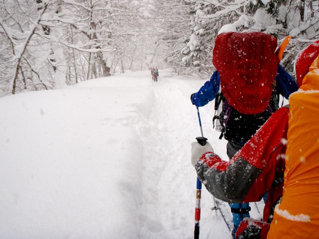 12月30日6:30集合し出発。山形県大井沢根子集落に9:40に到着。地元の方に頼んで車を置いてもらう。準備して10:30スキーで出発。凄い雪で屋根の上に1mは積もっていて、早速雪下ろしをしている家があっちこっちでみられた。
