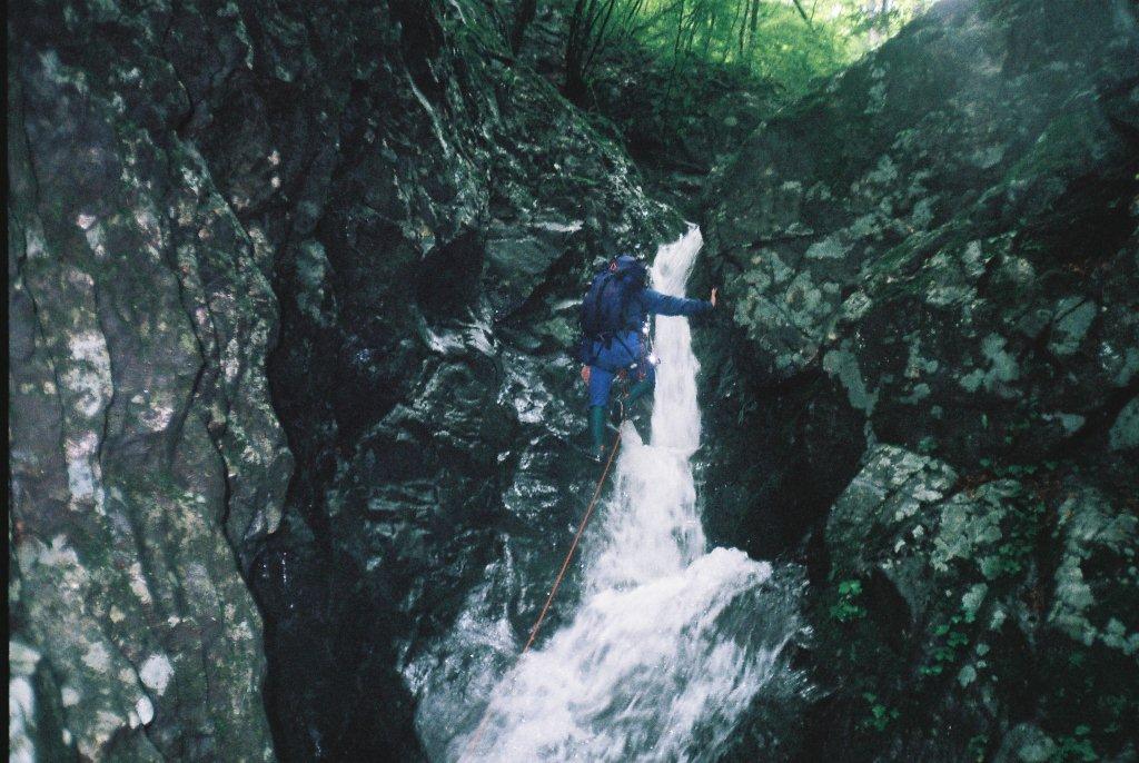 次にF4トイ状(すべり台)の滝が待ち受けており、突っ張りで越えて行くが水量が多いのと岩が全部濡れてツルツルのためスリップしそう(^_^;)