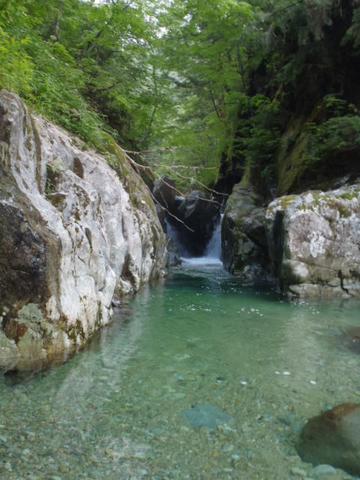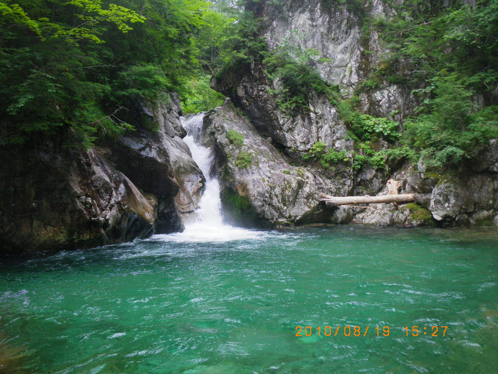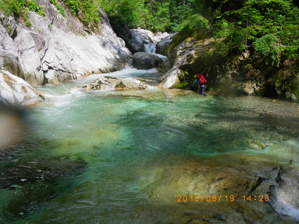 打込谷はエメラルドグリーンの澄んだ水がきれいな、明るい開けた沢でした。