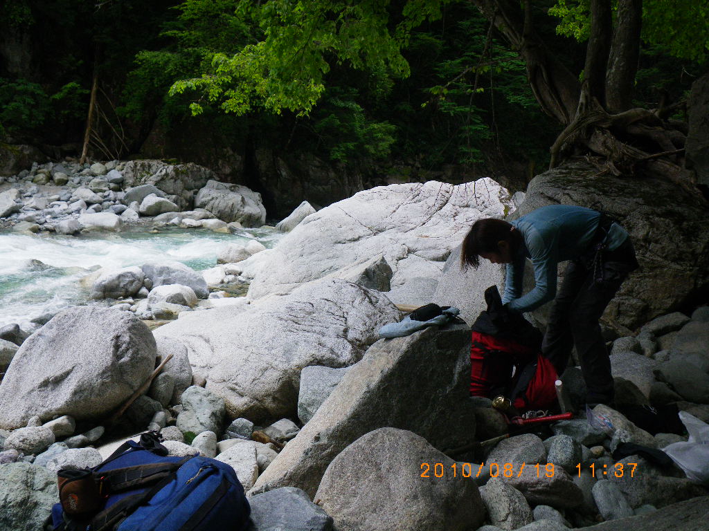 上流はナメ滝がこれでもかというほど続き、最後は笠ヶ岳のテン場にひょこっと出ました。
