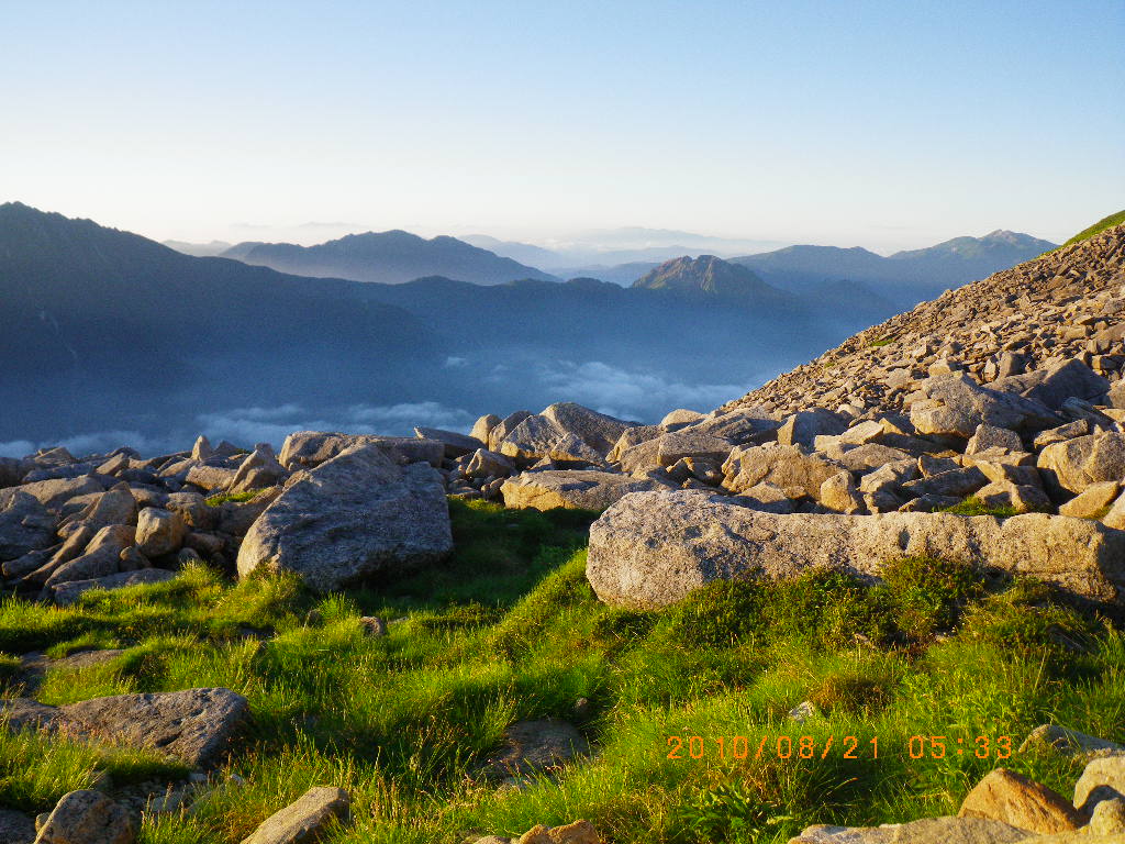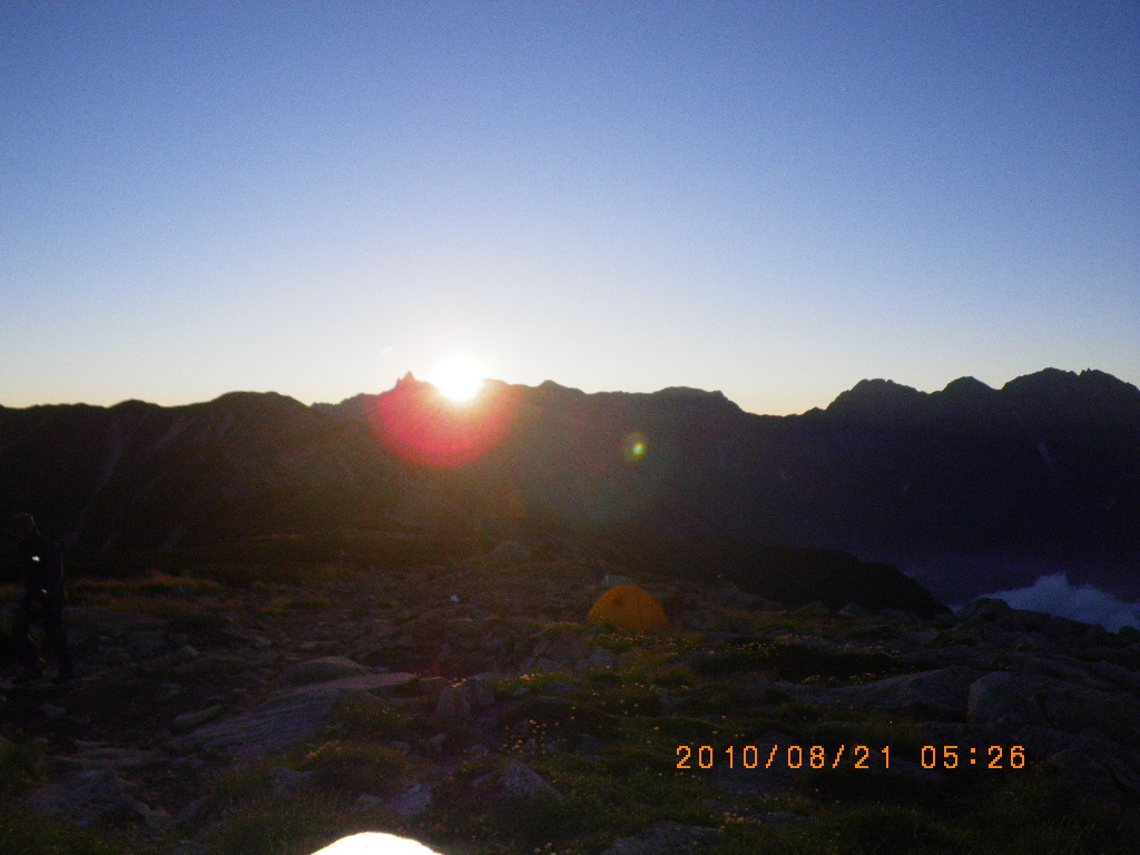 笠ヶ岳から見た夜明けは素晴らしく、ちょうど槍ヶ岳あたりから朝日が昇り、きれいでした。