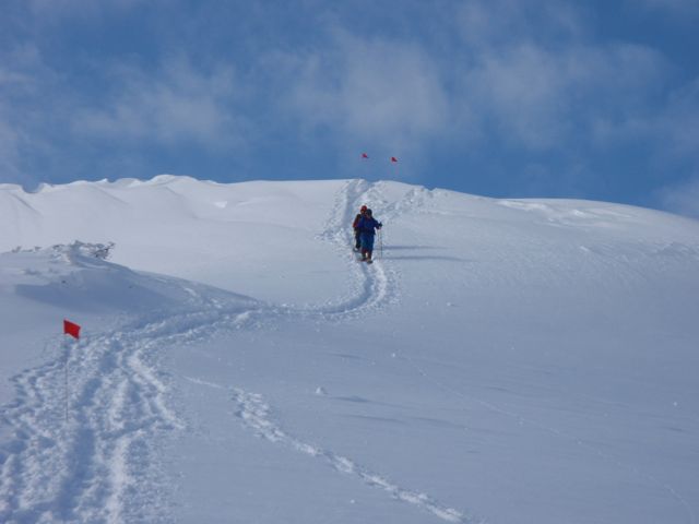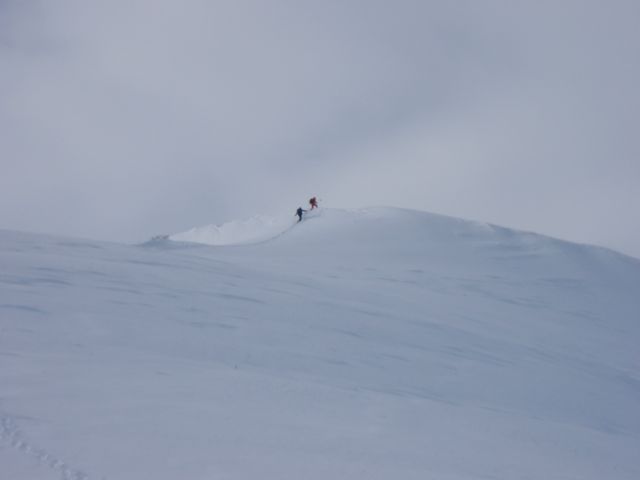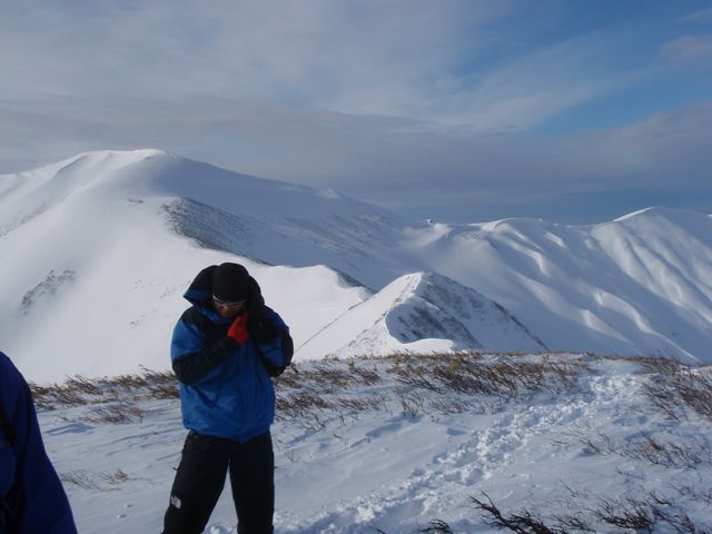 山頂付近は、本当になだらかで、真っ白で、曲線のきれいな山だなと思うが、吹雪いたら怖い山かな。と思いました。竜門山の山頂に10:25着。