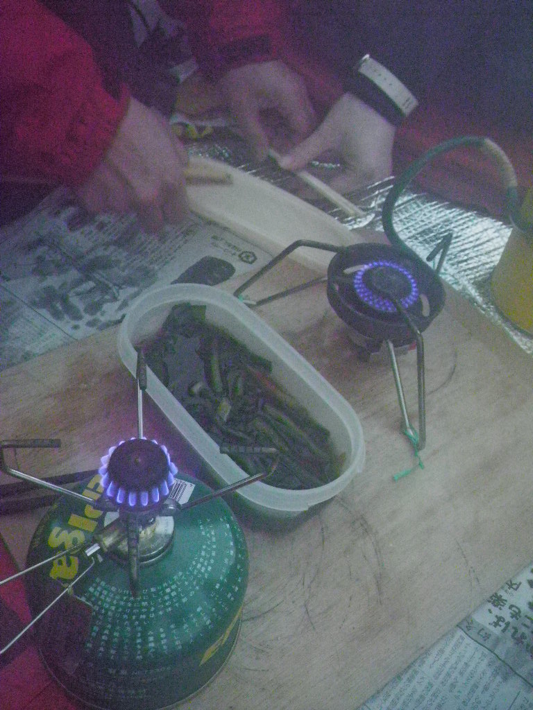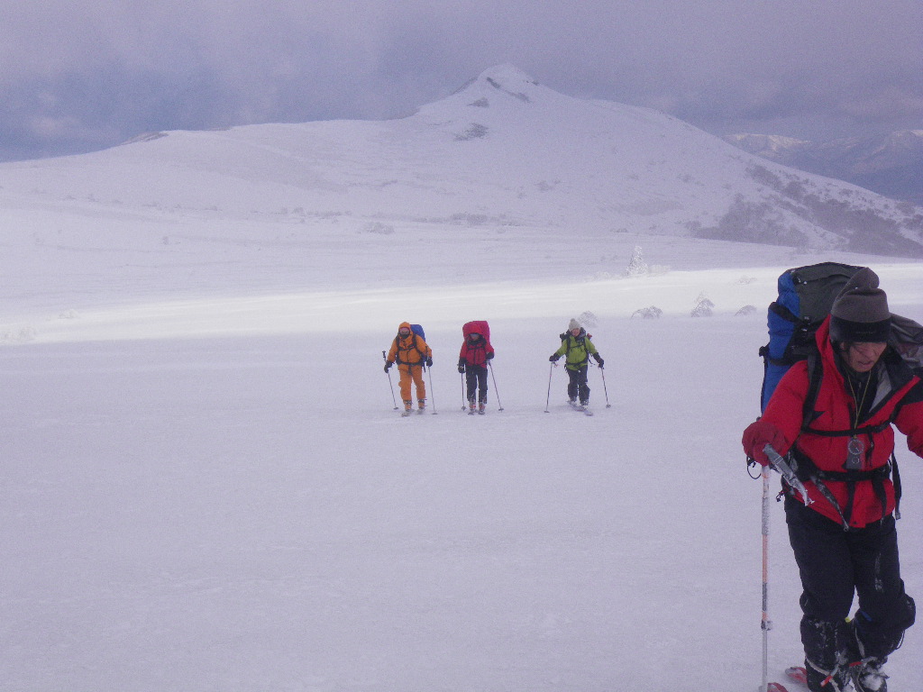 2日目、天候が回復し晴れ間がのぞく中目国内岳登頂。夜に雨が雪