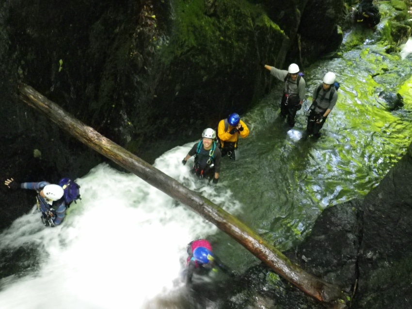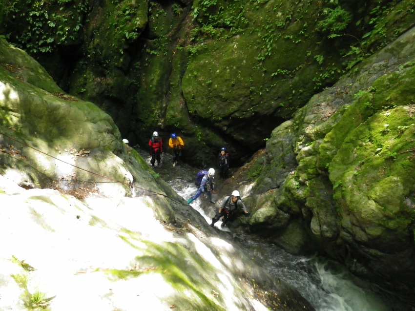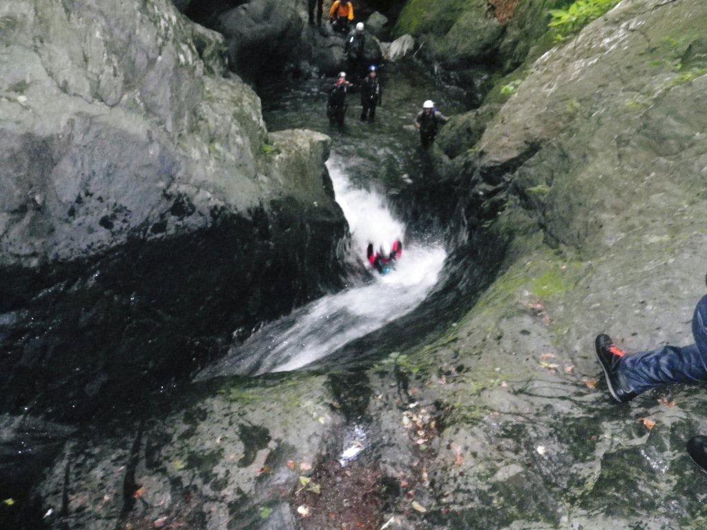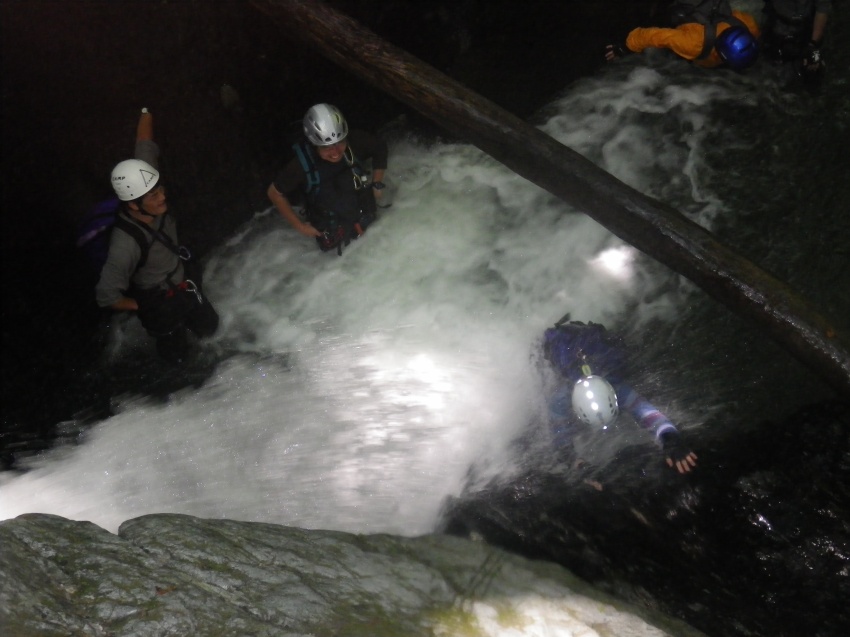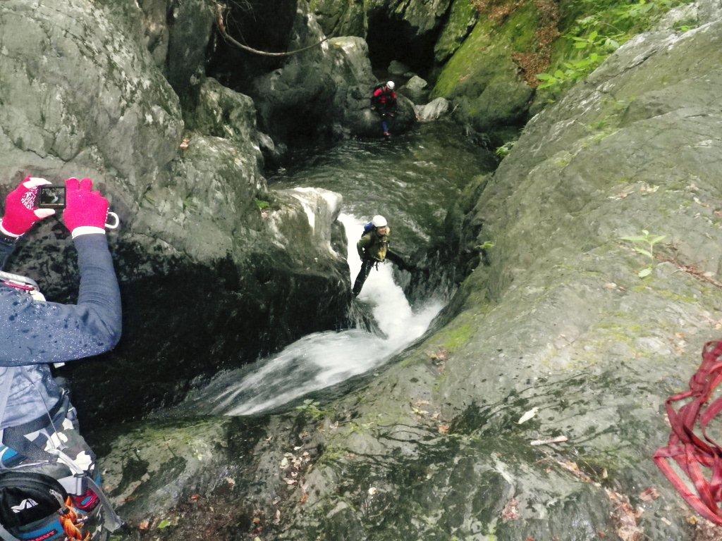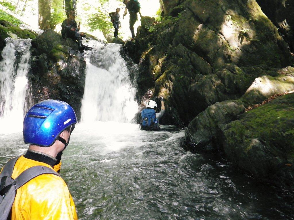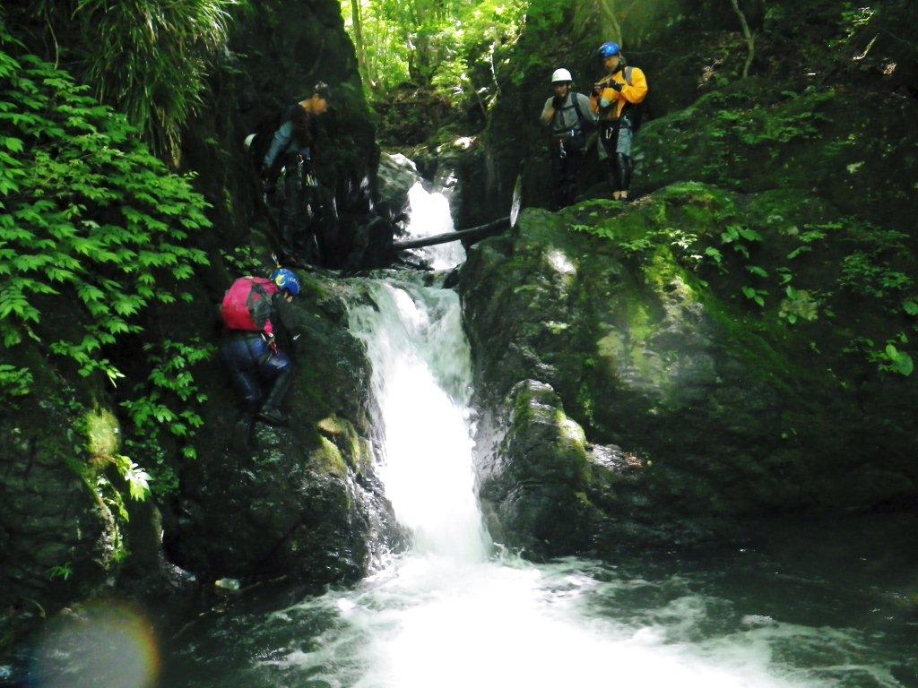 最初の難関、3mの滝、水中にも足のスタンスがなく、微妙なバランスで上がらなければならず、更に追い討ちで諸にシャワークライミングとなる。
