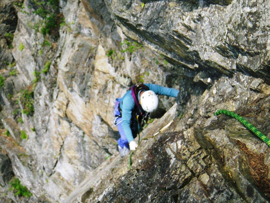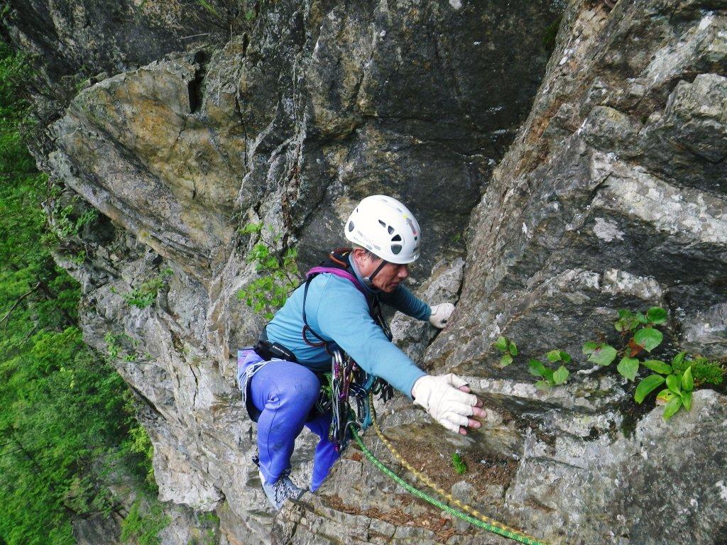 出だしの垂壁は水の浸み出しが岩場の下部を濡らしていやらしい感じ、乾いている処を選んで登る。