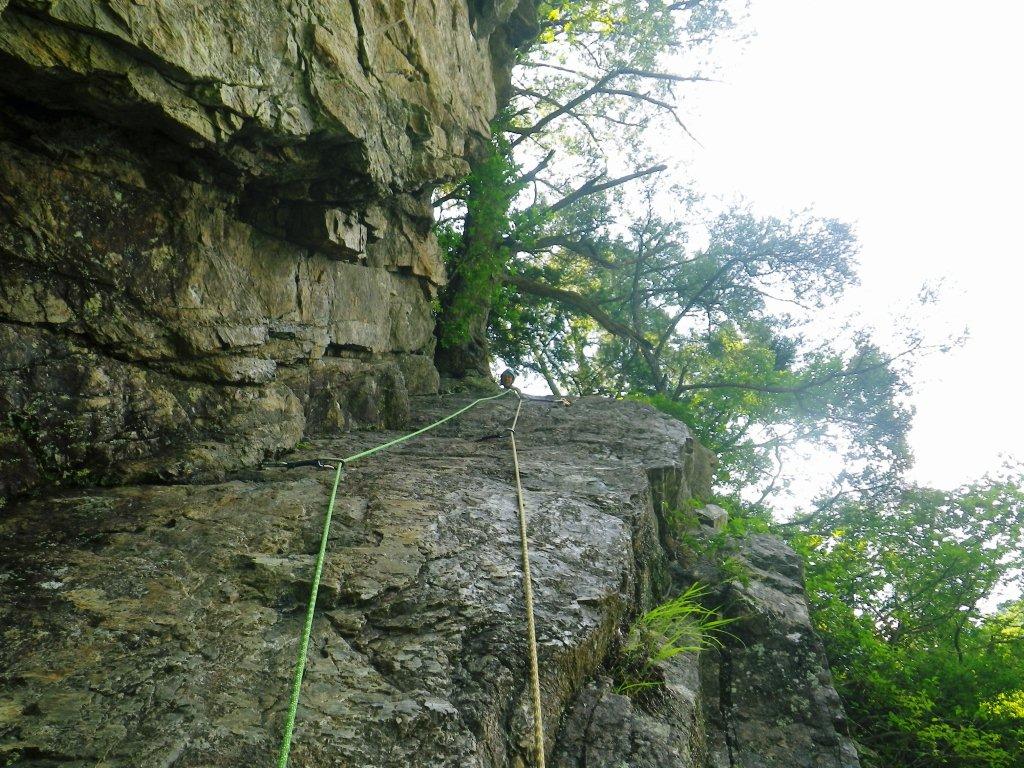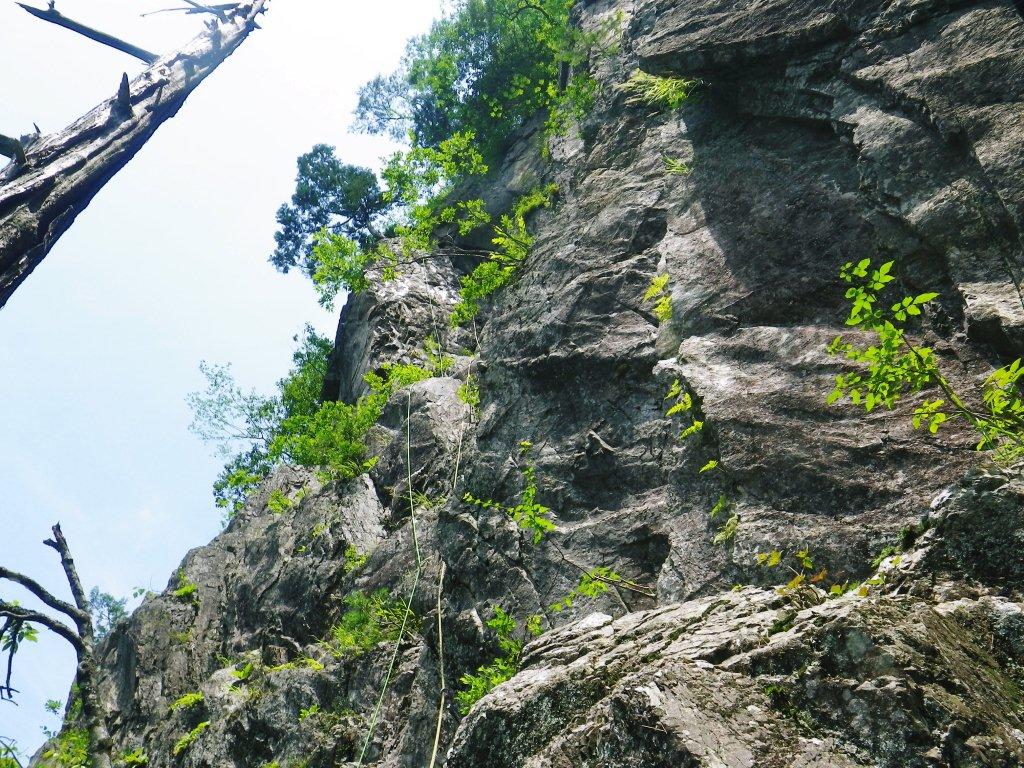 小テラスから第二スラブルートⅣ+へ取り付く、この時点で湿度と直射日光のため私は大汗をかき、喉はカラカラ・・熱中症が頭を過る。