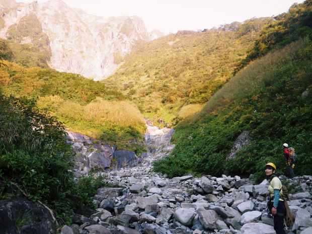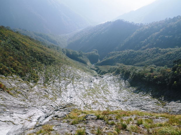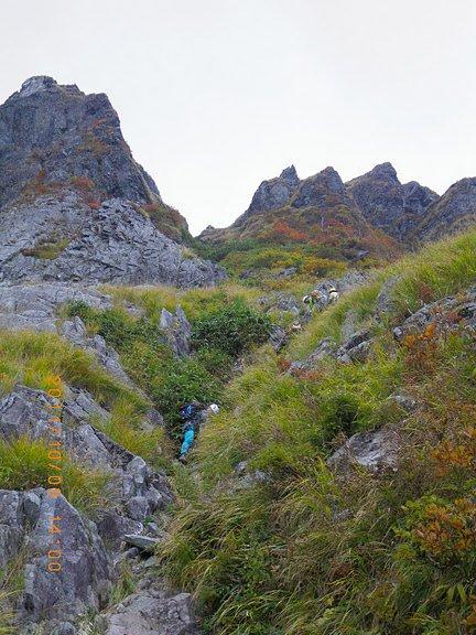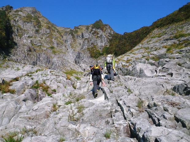 滑り易いナメ岩を次々と越え、一部、藪漕ぎ高巻きもこなし程なくカールボーデン下部に到着した。