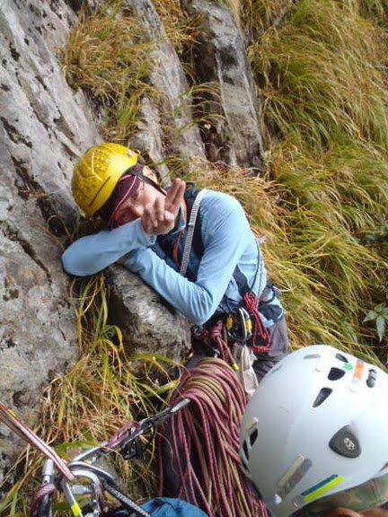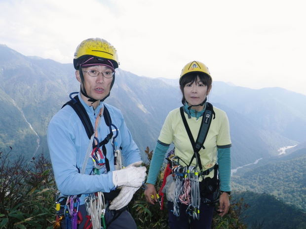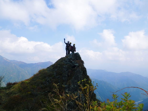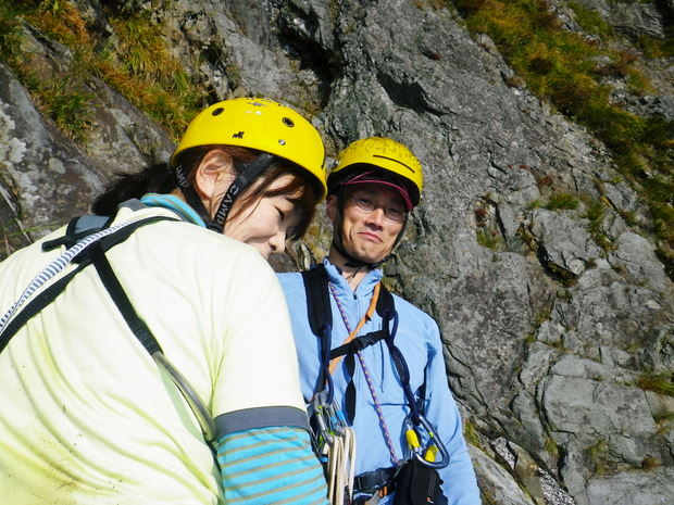 足場の悪い草付きをこなして終了点到着、取りあえず全員で握手を交わし一本立てる。