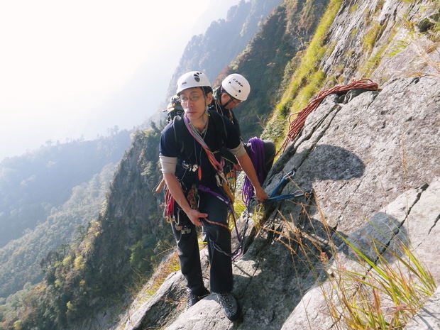 先ずは一部濡れてる箇所15mのトラバースから、滝野さんのリード。