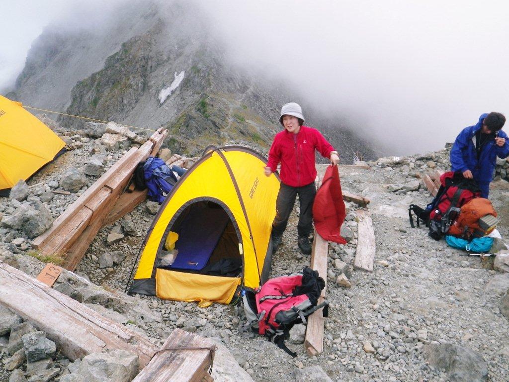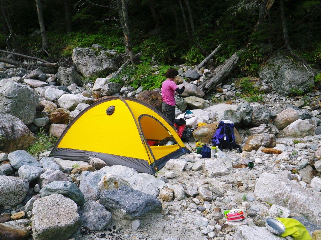 やっとのことで北鎌沢出合いの幕営地に到着した。「遠かった~」