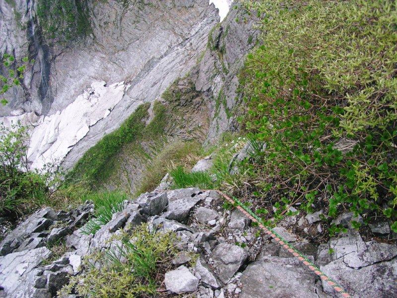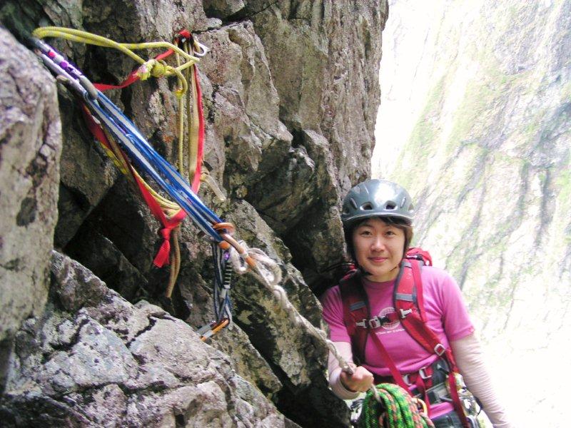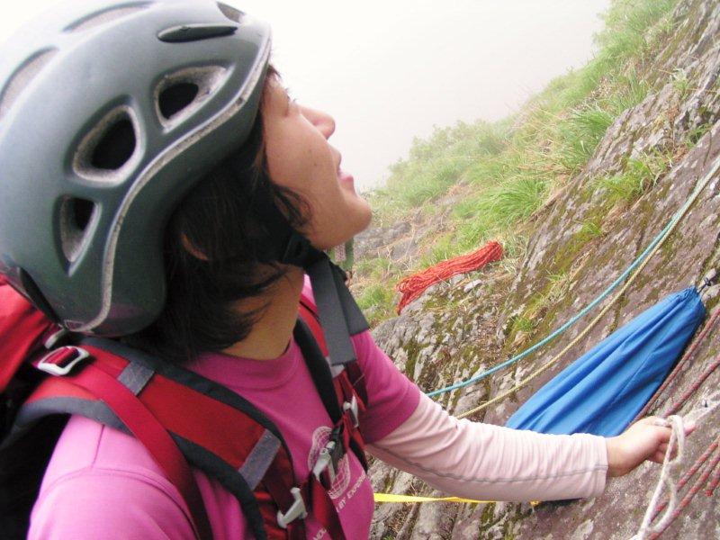 下降1ピッチ目、ロープ回収の際、中途半端に打ち込まれたハーケンにロープが絡み、登り返しを余儀なくされ10mほど私が登り無事回収する(^_^;)