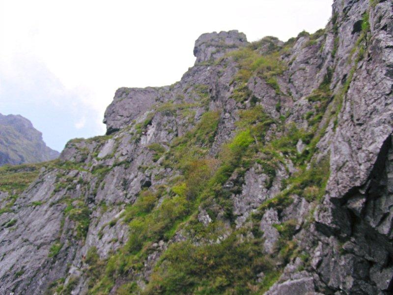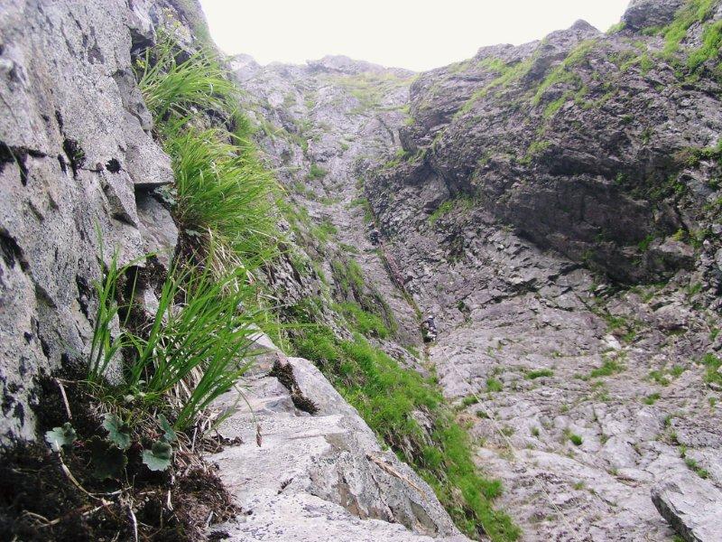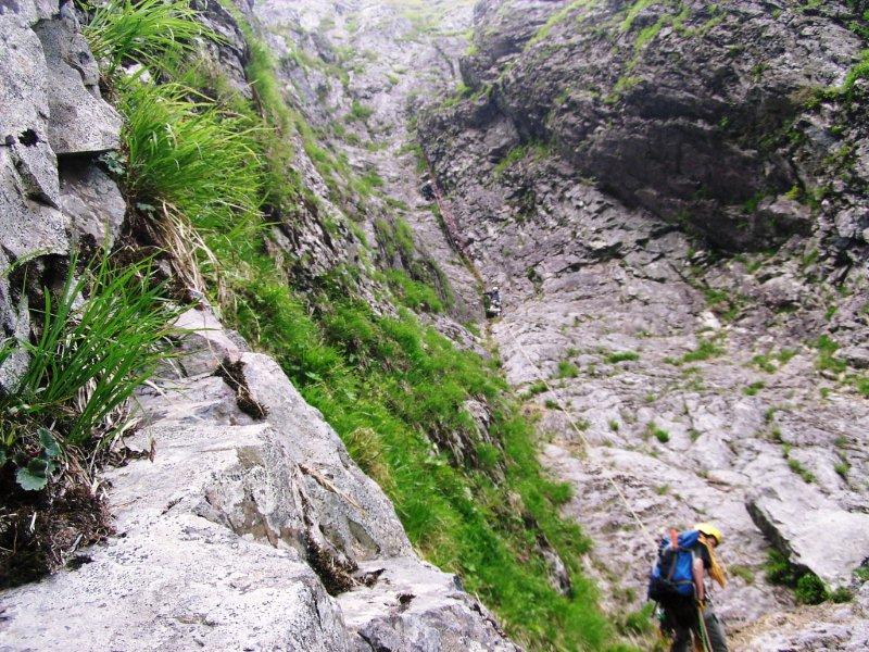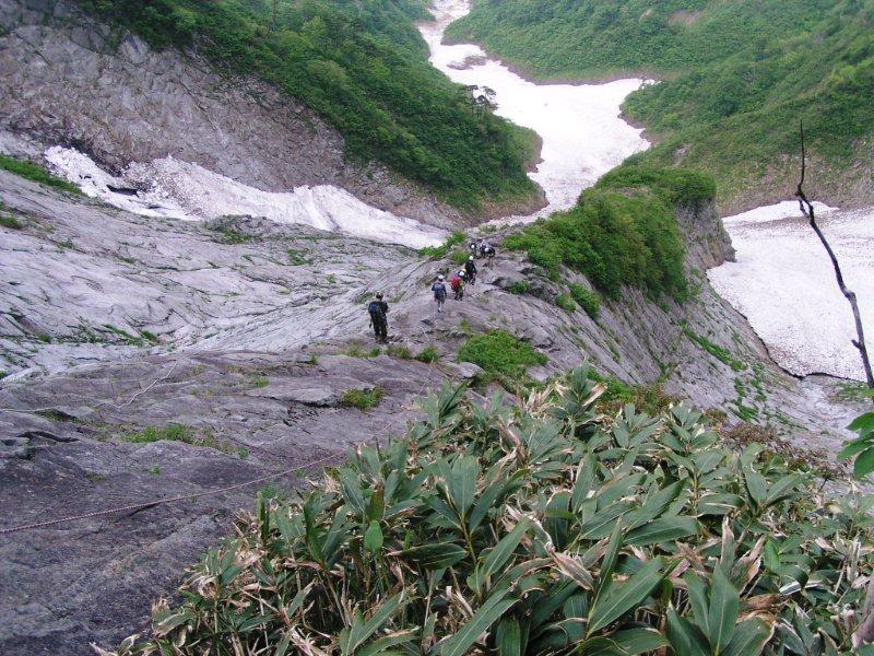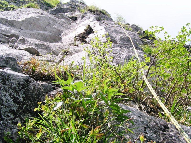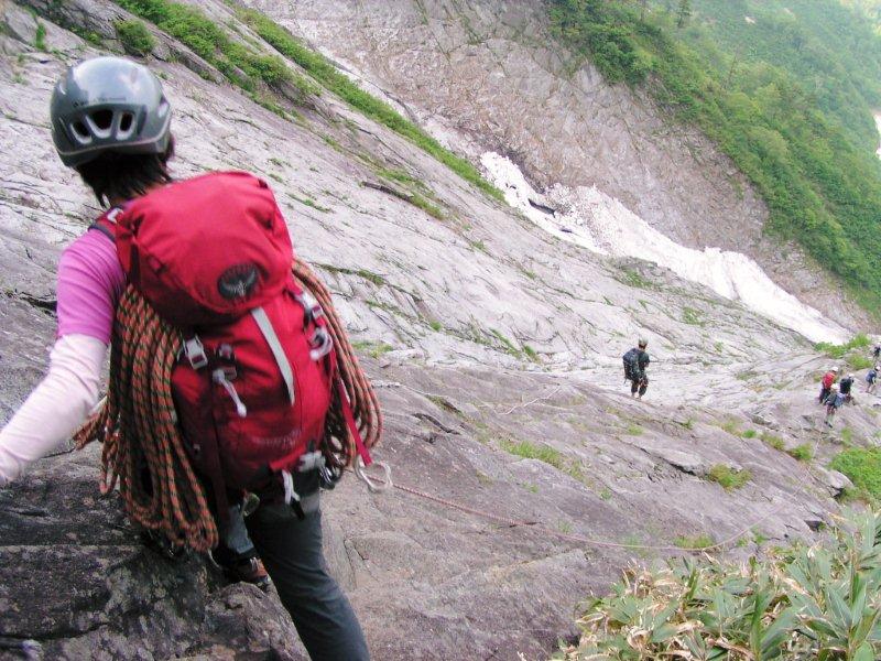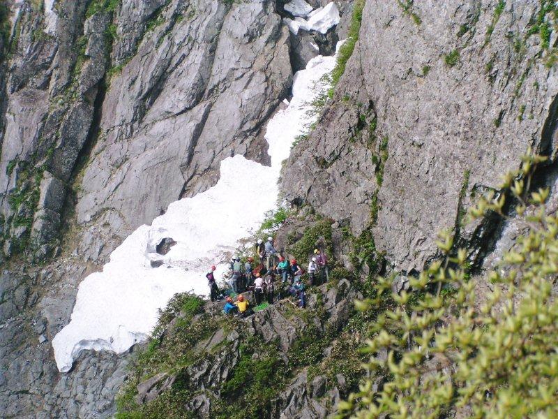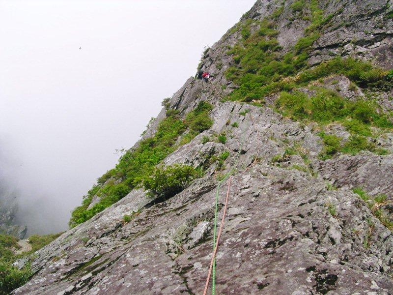 以後はツルベで登攀開始、2ピッチ目は私がリードしバンドを烏帽子沢方向にトラーバース気味に登り詰める、今回最初の失敗は一番乗りにも拘らず、後続ワンパーティーに先行されてしまったこと(>_<)