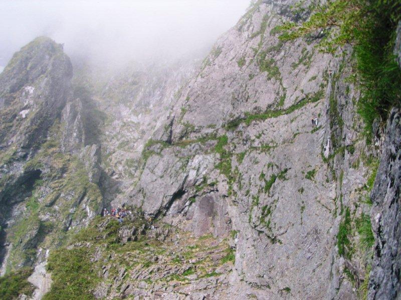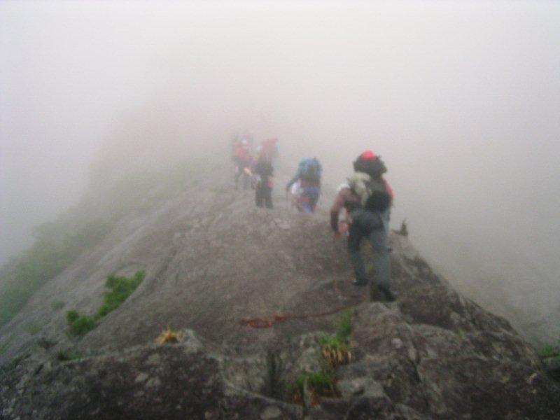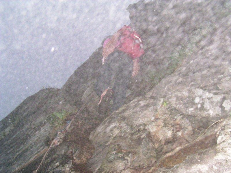 テールリッジは濡れていてスリップに用心。のっけから五級の岩を登っているようだ。