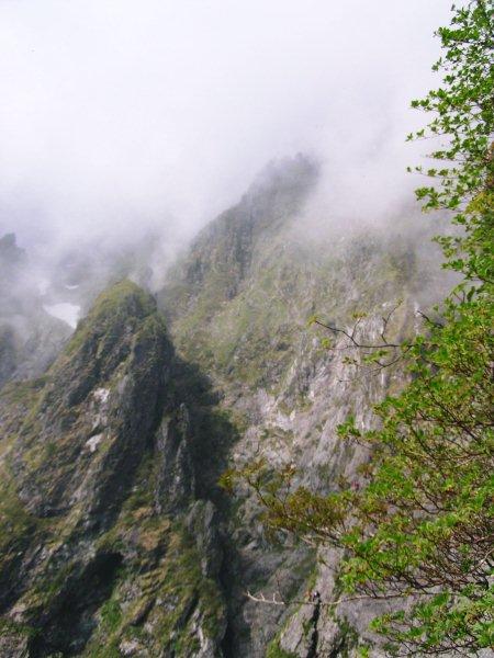 中央稜取り付きに到着、ガスも徐々にきれ始め、一ノ倉沢の迫力が目に飛び込んでくる。