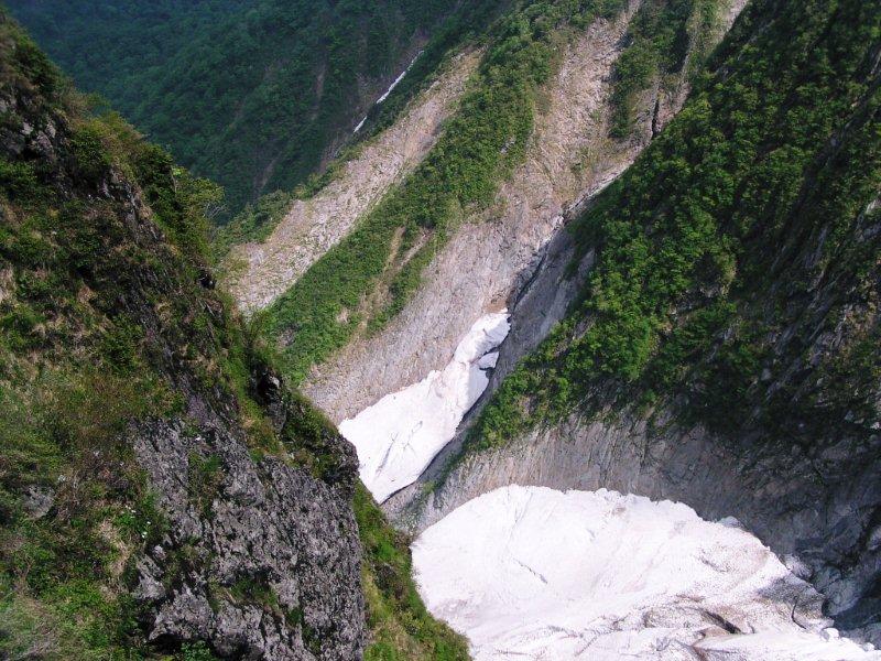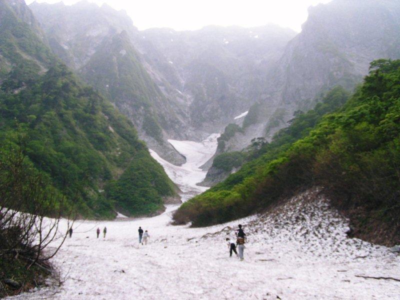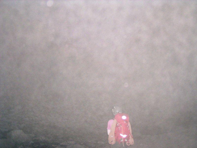 雪渓を登るもガスが立ち込め全貌が分からない。