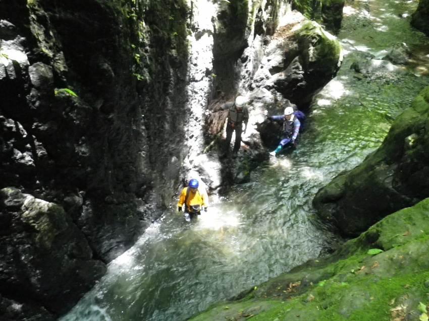 最初の難関、3mの滝、水中にも足のスタンスがなく、微妙なバランスで上がらなければならず、更に追い討ちで諸にシャワークライミングとなる。