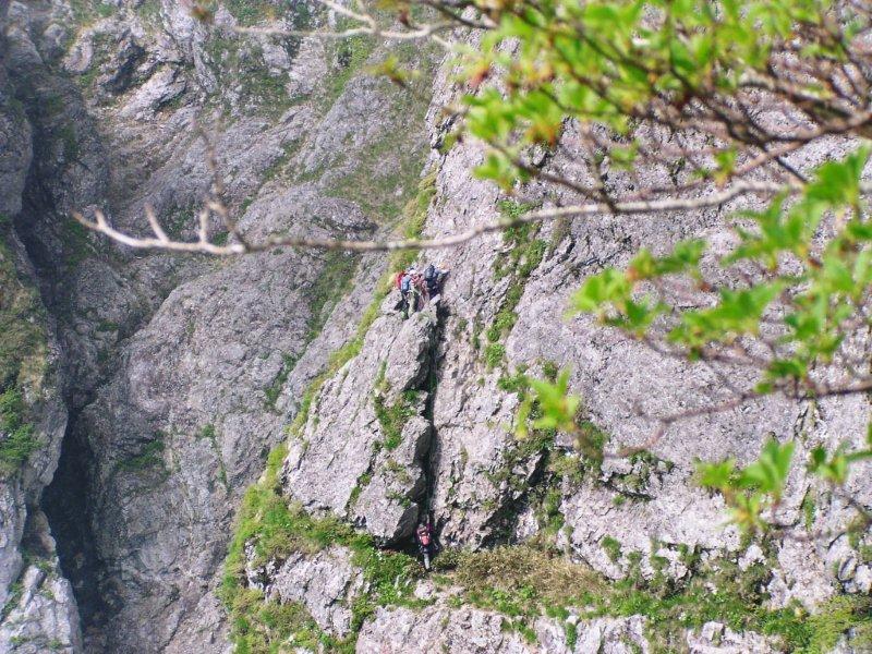 以後はツルベで登攀開始、2ピッチ目は私がリードしバンドを烏帽子沢方向にトラーバース気味に登り詰める、今回最初の失敗は一番乗りにも拘らず、後続ワンパーティーに先行されてしまったこと(>_<)